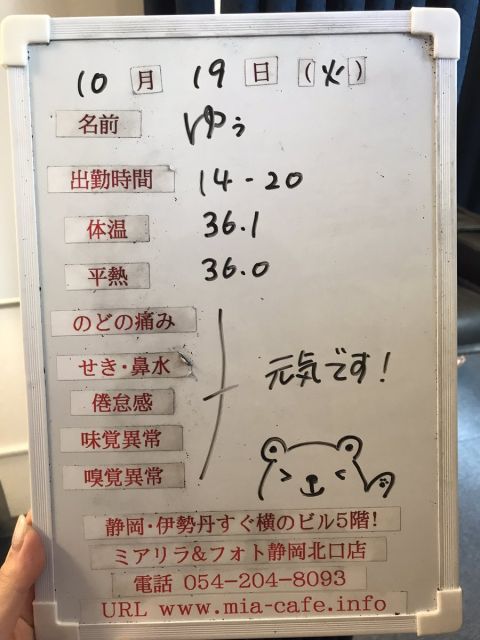 | 営業時間 | 静岡店は出勤スタッフがいれば営業です! 基本的に 12時~22時が営業時間です! ●静岡店のツイッター @shizuokamaidsan https://twitter.com/shizuokamaidsan ●ミア静岡店の営業曜日&営業時間● ☆月〜木 14:00〜22:00(最終受付20:00) ☆金曜日 12:00〜22:00(最終受付21:00) ☆土・日・祝 12:00〜22:00(最終受付21:00) 営業時間外はオンライン予約にてお願いいたします。 PC・携帯共通 → http://m-kanzume.moo.jp/yoyaku2/user.cgi ●ミアガイド出勤状況● スマホ・PC → 後日公開予定 ★静岡店スタッフによるミア甲府店でのメイドカフェリアル営業★ ☆不定期 サイトにてご確認ください。 http://market.chu.jp/schedule1/sche37.cgi | ||||||||||||||