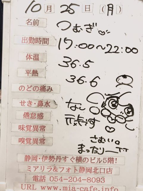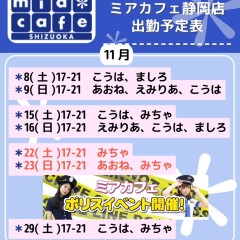 | 営業時間 | 静岡店は出勤スタッフがいれば営業です! 基本的に 12時~22時が営業時間です! ●静岡店のツイッター @shizuokamaidsan https://twitter.com/shizuokamaidsan ●ミア静岡店の営業曜日&営業時間● ☆月〜木 14:00〜22:00(最終受付20:00) ☆金曜日 12:00〜22:00(最終受付21:00) ☆土・日・祝 12:00〜22:00(最終受付21:00) 営業時間外はオンライン予約にてお願いいたします。 PC・携帯共通 → http://m-kanzume.moo.jp/yoyaku2/user.cgi ●ミアガイド出勤状況● スマホ・PC → 後日公開予定 ★静岡店スタッフによるミア甲府店でのメイドカフェリアル営業★ ☆不定期 サイトにてご確認ください。 http://market.chu.jp/schedule1/sche37.cgi | ||||||||||||||