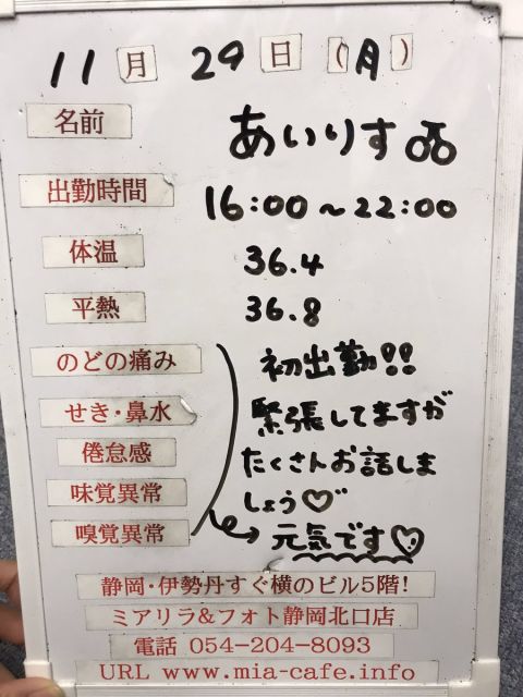 | 営業時間 | 静岡店は出勤スタッフがいれば営業です! 基本的に 12時~22時が営業時間です! ●静岡店のツイッター @shizuokamaidsan https://twitter.com/shizuokamaidsan ●ミア静岡店の営業曜日&営業時間● ☆月〜木 14:00〜22:00(最終受付20:00) ☆金曜日 12:00〜22:00(最終受付21:00) ☆土・日・祝 12:00〜22:00(最終受付21:00) 営業時間外はオンライン予約にてお願いいたします。 PC・携帯共通 → http://m-kanzume.moo.jp/yoyaku2/user.cgi ●ミアガイド出勤状況● スマホ・PC → 後日公開予定 ★静岡店スタッフによるミア甲府店でのメイドカフェリアル営業★ ☆不定期 サイトにてご確認ください。 http://market.chu.jp/schedule1/sche37.cgi | ||||||||||||||