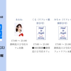 | å¶æ¥æé | é岡åºã¯åºå€ã¹ã¿ãããããã°å¶æ¥ã§ãïŒ åºæ¬çã«ã12æïœ22æãå¶æ¥æéã§ãïŒ âé岡åºã®ãã€ãã¿ãŒã@shizuokamaidsan https://twitter.com/shizuokamaidsan âãã¢é岡åºã®å¶æ¥ææ¥ïŒå¶æ¥æéâ âæãæšã14:00ã22:00(æçµåä»20:00) âéææ¥ã12:00ã22:00(æçµåä»21:00) âåã»æ¥ã»ç¥ã12:00ã22:00(æçµåä»21:00) å¶æ¥æéå€ã¯ãªã³ã©ã€ã³äºçŽã«ãŠãé¡ãããããŸãã ïŒ°ïŒ£ã»æºåž¯å ±éãâãhttp://m-kanzume.moo.jp/yoyaku2/user.cgi âãã¢ã¬ã€ãåºå€ç¶æ³â ã¹ããã»ïŒ°ïŒ£ãâãåŸæ¥å ¬éäºå® â é岡åºã¹ã¿ããã«ãããã¢ç²åºåºã§ã®ã¡ã€ãã«ãã§ãªã¢ã«å¶æ¥â âäžå®æ ããµã€ãã«ãŠã確èªãã ããã ãhttp://market.chu.jp/schedule1/sche37.cgi | ||||||||||||||
