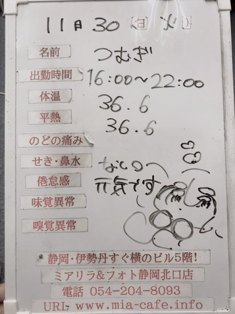 | 営業時間 | 静岡店は出勤スタッフがいれば営業です! 基本的に 12時~22時が営業時間です! ●静岡店のツイッター @shizuokamaidsan https://twitter.com/shizuokamaidsan ●ミア静岡店の営業曜日&営業時間● ☆月〜木 14:00〜22:00(最終受付20:00) ☆金曜日 12:00〜22:00(最終受付21:00) ☆土・日・祝 12:00〜22:00(最終受付21:00) 営業時間外はオンライン予約にてお願いいたします。 PC・携帯共通 → http://m-kanzume.moo.jp/yoyaku2/user.cgi ●ミアガイド出勤状況● スマホ・PC → 後日公開予定 ★静岡店スタッフによるミア甲府店でのメイドカフェリアル営業★ ☆不定期 サイトにてご確認ください。 http://market.chu.jp/schedule1/sche37.cgi | ||||||||||||||
