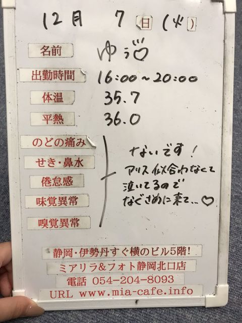 | 営業時間 | 静岡店は出勤スタッフがいれば営業です! 基本的に 12時~22時が営業時間です! ●静岡店のツイッター @shizuokamaidsan https://twitter.com/shizuokamaidsan ●ミア静岡店の営業曜日&営業時間● ☆月〜木 14:00〜22:00(最終受付20:00) ☆金曜日 12:00〜22:00(最終受付21:00) ☆土・日・祝 12:00〜22:00(最終受付21:00) 営業時間外はオンライン予約にてお願いいたします。 PC・携帯共通 → http://m-kanzume.moo.jp/yoyaku2/user.cgi ●ミアガイド出勤状況● スマホ・PC → 後日公開予定 ★静岡店スタッフによるミア甲府店でのメイドカフェリアル営業★ ☆不定期 サイトにてご確認ください。 http://market.chu.jp/schedule1/sche37.cgi | ||||||||||||||