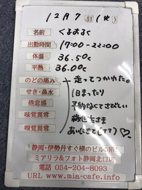 | 営業時間 | 静岡店は出勤スタッフがいれば営業です! 基本的に 12時~22時が営業時間です! ●静岡店のツイッター @shizuokamaidsan https://twitter.com/shizuokamaidsan ●ミア静岡店の営業曜日&営業時間● ☆月〜木 14:00〜22:00(最終受付20:00) ☆金曜日 12:00〜22:00(最終受付21:00) ☆土・日・祝 12:00〜22:00(最終受付21:00) 営業時間外はオンライン予約にてお願いいたします。 PC・携帯共通 → http://m-kanzume.moo.jp/yoyaku2/user.cgi ●ミアガイド出勤状況● スマホ・PC → 後日公開予定 ★静岡店スタッフによるミア甲府店でのメイドカフェリアル営業★ ☆不定期 サイトにてご確認ください。 http://market.chu.jp/schedule1/sche37.cgi | ||||||||||||||
