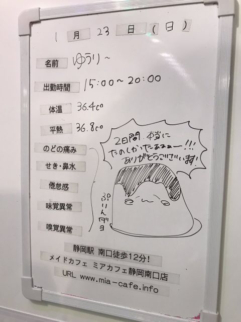 | 営業時間 | 静岡店は出勤スタッフがいれば営業です! 基本的に 12時~22時が営業時間です! ●静岡店のツイッター @shizuokamaidsan https://twitter.com/shizuokamaidsan ●ミア静岡店の営業曜日&営業時間● ☆月〜木 14:00〜22:00(最終受付20:00) ☆金曜日 12:00〜22:00(最終受付21:00) ☆土・日・祝 12:00〜22:00(最終受付21:00) 営業時間外はオンライン予約にてお願いいたします。 PC・携帯共通 → http://m-kanzume.moo.jp/yoyaku2/user.cgi ●ミアガイド出勤状況● スマホ・PC → 後日公開予定 ★静岡店スタッフによるミア甲府店でのメイドカフェリアル営業★ ☆不定期 サイトにてご確認ください。 http://market.chu.jp/schedule1/sche37.cgi | ||||||||||||||