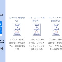 | å¶æ¥æé | é岡åºã¯åºå€ã¹ã¿ãããããã°å¶æ¥ã§ãïŒ åºæ¬çã«ã12æïœ22æãå¶æ¥æéã§ãïŒ âé岡åºã®ãã€ãã¿ãŒã@shizuokamaidsan https://twitter.com/shizuokamaidsan âãã¢é岡åºã®å¶æ¥ææ¥ïŒå¶æ¥æéâ âæãæšã14:00ã22:00(æçµåä»20:00) âéææ¥ã12:00ã22:00(æçµåä»21:00) âåã»æ¥ã»ç¥ã12:00ã22:00(æçµåä»21:00) å¶æ¥æéå€ã¯ãªã³ã©ã€ã³äºçŽã«ãŠãé¡ãããããŸãã ïŒ°ïŒ£ã»æºåž¯å ±éãâãhttp://m-kanzume.moo.jp/yoyaku2/user.cgi âãã¢ã¬ã€ãåºå€ç¶æ³â ã¹ããã»ïŒ°ïŒ£ãâãåŸæ¥å ¬éäºå® â é岡åºã¹ã¿ããã«ãããã¢ç²åºåºã§ã®ã¡ã€ãã«ãã§ãªã¢ã«å¶æ¥â âäžå®æ ããµã€ãã«ãŠã確èªãã ããã ãhttp://market.chu.jp/schedule1/sche37.cgi | ||||||||||||||