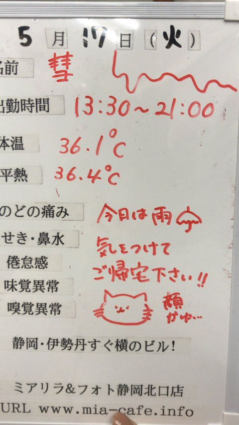 | 営業時間 | 静岡店は出勤スタッフがいれば営業です! 基本的に 12時~22時が営業時間です! ●静岡店のツイッター @shizuokamaidsan https://twitter.com/shizuokamaidsan ●ミア静岡店の営業曜日&営業時間● ☆月〜木 14:00〜22:00(最終受付20:00) ☆金曜日 12:00〜22:00(最終受付21:00) ☆土・日・祝 12:00〜22:00(最終受付21:00) 営業時間外はオンライン予約にてお願いいたします。 PC・携帯共通 → http://m-kanzume.moo.jp/yoyaku2/user.cgi ●ミアガイド出勤状況● スマホ・PC → 後日公開予定 ★静岡店スタッフによるミア甲府店でのメイドカフェリアル営業★ ☆不定期 サイトにてご確認ください。 http://market.chu.jp/schedule1/sche37.cgi | ||||||||||||||
