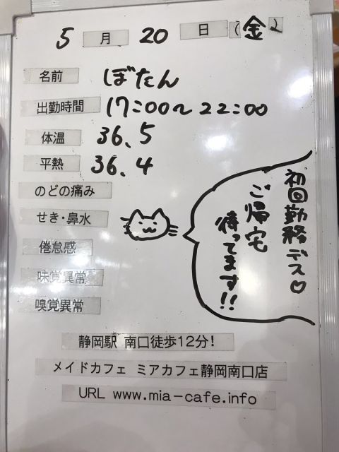 | 営業時間 | 静岡店は出勤スタッフがいれば営業です! 基本的に 12時~22時が営業時間です! ●静岡店のツイッター @shizuokamaidsan https://twitter.com/shizuokamaidsan ●ミア静岡店の営業曜日&営業時間● ☆月〜木 14:00〜22:00(最終受付20:00) ☆金曜日 12:00〜22:00(最終受付21:00) ☆土・日・祝 12:00〜22:00(最終受付21:00) 営業時間外はオンライン予約にてお願いいたします。 PC・携帯共通 → http://m-kanzume.moo.jp/yoyaku2/user.cgi ●ミアガイド出勤状況● スマホ・PC → 後日公開予定 ★静岡店スタッフによるミア甲府店でのメイドカフェリアル営業★ ☆不定期 サイトにてご確認ください。 http://market.chu.jp/schedule1/sche37.cgi | ||||||||||||||