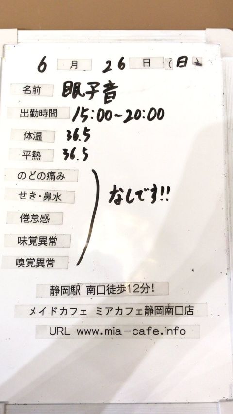 | 営業時間 | 静岡店は出勤スタッフがいれば営業です! 基本的に 12時~22時が営業時間です! ●静岡店のツイッター @shizuokamaidsan https://twitter.com/shizuokamaidsan ●ミア静岡店の営業曜日&営業時間● ☆月〜木 14:00〜22:00(最終受付20:00) ☆金曜日 12:00〜22:00(最終受付21:00) ☆土・日・祝 12:00〜22:00(最終受付21:00) 営業時間外はオンライン予約にてお願いいたします。 PC・携帯共通 → http://m-kanzume.moo.jp/yoyaku2/user.cgi ●ミアガイド出勤状況● スマホ・PC → 後日公開予定 ★静岡店スタッフによるミア甲府店でのメイドカフェリアル営業★ ☆不定期 サイトにてご確認ください。 http://market.chu.jp/schedule1/sche37.cgi | ||||||||||||||