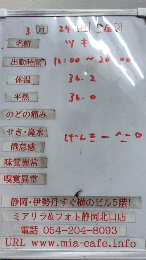 | 営業時間 | 静岡店は出勤スタッフがいれば営業です! 基本的に 12時~22時が営業時間です! ●静岡店のツイッター @shizuokamaidsan https://twitter.com/shizuokamaidsan ●ミア静岡店の営業曜日&営業時間● ☆月〜木 14:00〜22:00(最終受付20:00) ☆金曜日 12:00〜22:00(最終受付21:00) ☆土・日・祝 12:00〜22:00(最終受付21:00) 営業時間外はオンライン予約にてお願いいたします。 PC・携帯共通 → http://m-kanzume.moo.jp/yoyaku2/user.cgi ●ミアガイド出勤状況● スマホ・PC → 後日公開予定 ★静岡店スタッフによるミア甲府店でのメイドカフェリアル営業★ ☆不定期 サイトにてご確認ください。 http://market.chu.jp/schedule1/sche37.cgi | ||||||||||||||