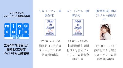 | 営業時間 | 静岡店は出勤スタッフがいれば営業です! 基本的に 12時~22時が営業時間です! ●静岡店のツイッター @shizuokamaidsan https://twitter.com/shizuokamaidsan ●ミア静岡店の営業曜日&営業時間● ☆月〜木 14:00〜22:00(最終受付20:00) ☆金曜日 12:00〜22:00(最終受付21:00) ☆土・日・祝 12:00〜22:00(最終受付21:00) 営業時間外はオンライン予約にてお願いいたします。 PC・携帯共通 → http://m-kanzume.moo.jp/yoyaku2/user.cgi ●ミアガイド出勤状況● スマホ・PC → 後日公開予定 ★静岡店スタッフによるミア甲府店でのメイドカフェリアル営業★ ☆不定期 サイトにてご確認ください。 http://market.chu.jp/schedule1/sche37.cgi | ||||||||||||||