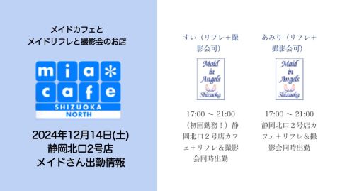 | 営業時間 | 静岡店は出勤スタッフがいれば営業です! 基本的に 12時~22時が営業時間です! ●静岡店のツイッター @shizuokamaidsan https://twitter.com/shizuokamaidsan ●ミア静岡店の営業曜日&営業時間● ☆月〜木 14:00〜22:00(最終受付20:00) ☆金曜日 12:00〜22:00(最終受付21:00) ☆土・日・祝 12:00〜22:00(最終受付21:00) 営業時間外はオンライン予約にてお願いいたします。 PC・携帯共通 → http://m-kanzume.moo.jp/yoyaku2/user.cgi ●ミアガイド出勤状況● スマホ・PC → 後日公開予定 ★静岡店スタッフによるミア甲府店でのメイドカフェリアル営業★ ☆不定期 サイトにてご確認ください。 http://market.chu.jp/schedule1/sche37.cgi | ||||||||||||||