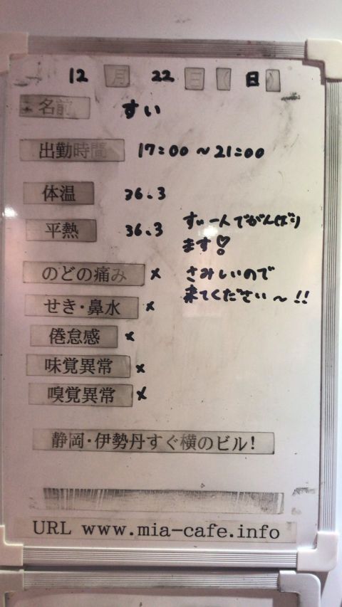 | 営業時間 | 静岡店は出勤スタッフがいれば営業です! 基本的に 12時~22時が営業時間です! ●静岡店のツイッター @shizuokamaidsan https://twitter.com/shizuokamaidsan ●ミア静岡店の営業曜日&営業時間● ☆月〜木 14:00〜22:00(最終受付20:00) ☆金曜日 12:00〜22:00(最終受付21:00) ☆土・日・祝 12:00〜22:00(最終受付21:00) 営業時間外はオンライン予約にてお願いいたします。 PC・携帯共通 → http://m-kanzume.moo.jp/yoyaku2/user.cgi ●ミアガイド出勤状況● スマホ・PC → 後日公開予定 ★静岡店スタッフによるミア甲府店でのメイドカフェリアル営業★ ☆不定期 サイトにてご確認ください。 http://market.chu.jp/schedule1/sche37.cgi | ||||||||||||||