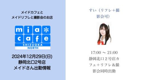 | 営業時間 | 静岡店は出勤スタッフがいれば営業です! 基本的に 12時~22時が営業時間です! ●静岡店のツイッター @shizuokamaidsan https://twitter.com/shizuokamaidsan ●ミア静岡店の営業曜日&営業時間● ☆月〜木 14:00〜22:00(最終受付20:00) ☆金曜日 12:00〜22:00(最終受付21:00) ☆土・日・祝 12:00〜22:00(最終受付21:00) 営業時間外はオンライン予約にてお願いいたします。 PC・携帯共通 → http://m-kanzume.moo.jp/yoyaku2/user.cgi ●ミアガイド出勤状況● スマホ・PC → 後日公開予定 ★静岡店スタッフによるミア甲府店でのメイドカフェリアル営業★ ☆不定期 サイトにてご確認ください。 http://market.chu.jp/schedule1/sche37.cgi | ||||||||||||||