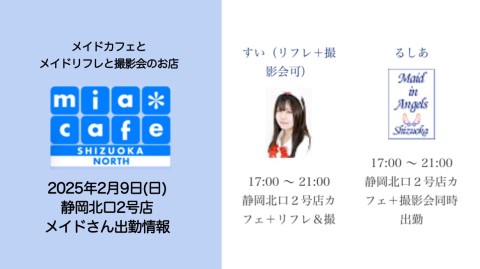 | 営業時間 | 静岡店は出勤スタッフがいれば営業です! 基本的に 12時~22時が営業時間です! ●静岡店のツイッター @shizuokamaidsan https://twitter.com/shizuokamaidsan ●ミア静岡店の営業曜日&営業時間● ☆月〜木 14:00〜22:00(最終受付20:00) ☆金曜日 12:00〜22:00(最終受付21:00) ☆土・日・祝 12:00〜22:00(最終受付21:00) 営業時間外はオンライン予約にてお願いいたします。 PC・携帯共通 → http://m-kanzume.moo.jp/yoyaku2/user.cgi ●ミアガイド出勤状況● スマホ・PC → 後日公開予定 ★静岡店スタッフによるミア甲府店でのメイドカフェリアル営業★ ☆不定期 サイトにてご確認ください。 http://market.chu.jp/schedule1/sche37.cgi | ||||||||||||||