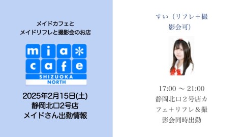 | 営業時間 | 静岡店は出勤スタッフがいれば営業です! 基本的に 12時~22時が営業時間です! ●静岡店のツイッター @shizuokamaidsan https://twitter.com/shizuokamaidsan ●ミア静岡店の営業曜日&営業時間● ☆月〜木 14:00〜22:00(最終受付20:00) ☆金曜日 12:00〜22:00(最終受付21:00) ☆土・日・祝 12:00〜22:00(最終受付21:00) 営業時間外はオンライン予約にてお願いいたします。 PC・携帯共通 → http://m-kanzume.moo.jp/yoyaku2/user.cgi ●ミアガイド出勤状況● スマホ・PC → 後日公開予定 ★静岡店スタッフによるミア甲府店でのメイドカフェリアル営業★ ☆不定期 サイトにてご確認ください。 http://market.chu.jp/schedule1/sche37.cgi | ||||||||||||||