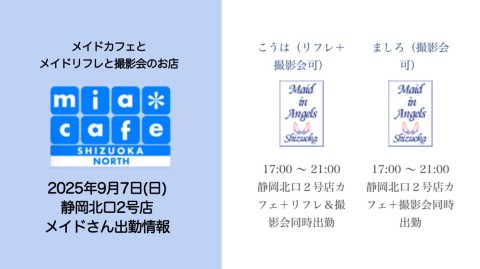 | 営業時間 | 静岡店は出勤スタッフがいれば営業です! 基本的に 12時~22時が営業時間です! ●静岡店のツイッター @shizuokamaidsan https://twitter.com/shizuokamaidsan ●ミア静岡店の営業曜日&営業時間● ☆月〜木 14:00〜22:00(最終受付20:00) ☆金曜日 12:00〜22:00(最終受付21:00) ☆土・日・祝 12:00〜22:00(最終受付21:00) 営業時間外はオンライン予約にてお願いいたします。 PC・携帯共通 → http://m-kanzume.moo.jp/yoyaku2/user.cgi ●ミアガイド出勤状況● スマホ・PC → 後日公開予定 ★静岡店スタッフによるミア甲府店でのメイドカフェリアル営業★ ☆不定期 サイトにてご確認ください。 http://market.chu.jp/schedule1/sche37.cgi | ||||||||||||||