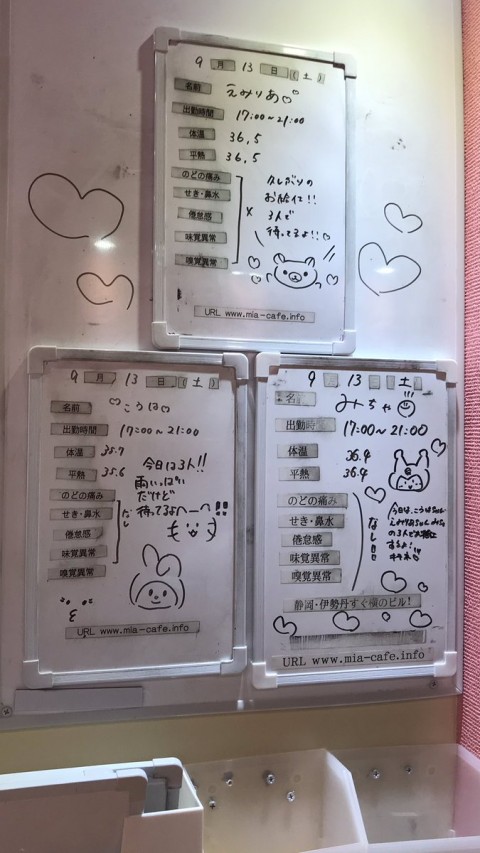 営業時間 静岡店は出勤スタッフがいれば営業です! 基本的に 12時~22時が営業時間です! ●静岡店のツイッター @shizuokamaidsan https://twitter.com/shizuokamaidsan ●ミア静岡店の営業曜日&営業時間● ☆月〜木 14:00〜22:00(最終受付20:00) ☆金曜日 12:00〜22:00(最終受付21:00) ☆土・日・祝 12:00〜22:00(最終受付21:00) 営業時間外はオンライン予約にてお願いいたします。 PC・携帯共通 → http://m-kanzume.moo.jp/yoyaku2/user.cgi ●ミアガイド出勤状況● スマホ・PC → 後日公開予定 ★静岡店スタッフによるミア甲府店でのメイドカフェリアル営業★ ☆不定期  サイトにてご確認ください。  http://market.chu.jp/schedule1/sche37.cgi