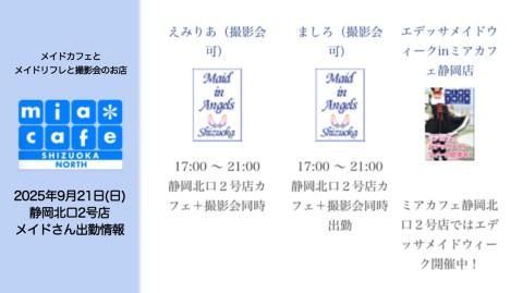 👑本日9月21日(日)のミアカフェ静岡北口2号店 💖17:00〜21:00営業💖 💙ましろ・えみりあ 出勤 💙エデッサメイドウィーク #ロリ #美少女 #かわいい #メイドさん といっぱいお話しできる #メイドカフェ 🍺飲み放題30分900円 #メイドリフレ #撮影会 10分1000円 ■マップ https://t.co/K495cglER6 https://t.co/3dRdlNvzan