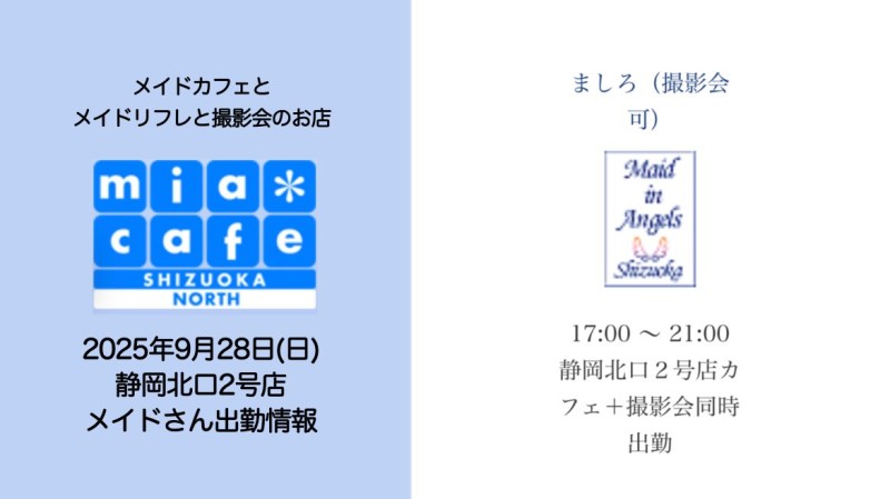 å¶æ¥æé | é岡åºã¯åºå€ã¹ã¿ãããããã°å¶æ¥ã§ãïŒ åºæ¬çã«ã12æïœ22æãå¶æ¥æéã§ãïŒ âé岡åºã®ãã€ãã¿ãŒã@shizuokamaidsan https://twitter.com/shizuokamaidsan âãã¢é岡åºã®å¶æ¥ææ¥ïŒå¶æ¥æéâ âæãæšã14:00ã22:00(æçµåä»20:00) âéææ¥ã12:00ã22:00(æçµåä»21:00) âåã»æ¥ã»ç¥ã12:00ã22:00(æçµåä»21:00) å¶æ¥æéå€ã¯ãªã³ã©ã€ã³äºçŽã«ãŠãé¡ãããããŸãã ïŒ°ïŒ£ã»æºåž¯å ±éãâãhttp://m-kanzume.moo.jp/yoyaku2/user.cgi âãã¢ã¬ã€ãåºå€ç¶æ³â ã¹ããã»ïŒ°ïŒ£ãâãåŸæ¥å ¬éäºå® â é岡åºã¹ã¿ããã«ãããã¢ç²åºåºã§ã®ã¡ã€ãã«ãã§ãªã¢ã«å¶æ¥â âäžå®æ ããµã€ãã«ãŠã確èªãã ããã ãhttp://market.chu.jp/schedule1/sche37.cgi | ||||||||||||||
