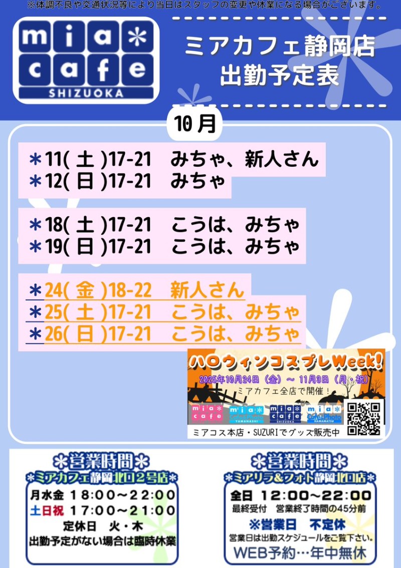 ●#メイドカフェ ミアカフェ #静岡 北口2号店● ☕️営業予定日☕️ 💖10月12日(日)17-21みちゃ・🔰新人はるひ 💖10月18日(土)17-21こうは・みちゃ・🔰新人はるひ 💖10月19日(日)17-21こうは・みちゃ 🧙‍♀️ハロウィン 🎃10月25日(土)17-21こうは・ましろ・みちゃ 🎃10月26日(日)17-21こうは・ましろ・みちゃ https://t.co/pELHn1f7Lw