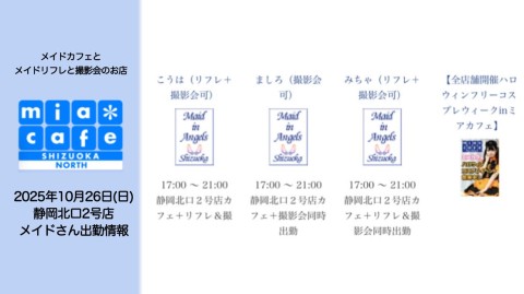 ●#メイドカフェ ミアカフェ #静岡 北口2号店● ☕️営業予定日☕️ 💖10月12日(日)17-21みちゃ・🔰新人はるひ 💖10月18日(土)17-21こうは・みちゃ・🔰新人はるひ 💖10月19日(日)17-21こうは・みちゃ 🧙‍♀️ハロウィン 🎃10月25日(土)17-21こうは・ましろ・みちゃ 🎃10月26日(日)17-21こうは・ましろ・みちゃ https://t.co/pELHn1f7Lw