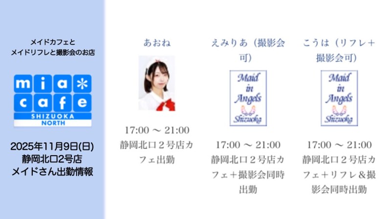 | 営業時間 | 静岡店は出勤スタッフがいれば営業です! 基本的に 12時~22時が営業時間です! ●静岡店のツイッター @shizuokamaidsan https://twitter.com/shizuokamaidsan ●ミア静岡店の営業曜日&営業時間● ☆月〜木 14:00〜22:00(最終受付20:00) ☆金曜日 12:00〜22:00(最終受付21:00) ☆土・日・祝 12:00〜22:00(最終受付21:00) 営業時間外はオンライン予約にてお願いいたします。 PC・携帯共通 → http://m-kanzume.moo.jp/yoyaku2/user.cgi ●ミアガイド出勤状況● スマホ・PC → 後日公開予定 ★静岡店スタッフによるミア甲府店でのメイドカフェリアル営業★ ☆不定期 サイトにてご確認ください。 http://market.chu.jp/schedule1/sche37.cgi | ||||||||||||||