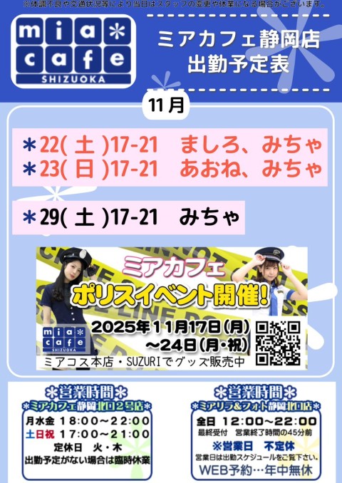 ★#メイドカフェ ・ #ミアカフェ #静岡 北口2号店★ ☕️営業予定日☕️ 💖11月15日(土) 17-21 みちゃ 💖11月16日(日) 17-21 あおね・えみりあ・こうは 🚨ポリスイベント🚨 🚨11月22日(土) 17-21 ましろ・みちゃ 🚨11月23日(日) 17-21 あおね・みちゃ 💖11月29日(土) 17-21 みちゃ #コンカフェ https://t.co/8YrP0R97Yy