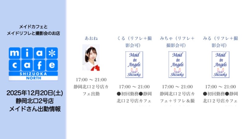 | 営業時間 | 静岡店は出勤スタッフがいれば営業です! 基本的に 12時~22時が営業時間です! ●静岡店のツイッター @shizuokamaidsan https://twitter.com/shizuokamaidsan ●ミア静岡店の営業曜日&営業時間● ☆月〜木 14:00〜22:00(最終受付20:00) ☆金曜日 12:00〜22:00(最終受付21:00) ☆土・日・祝 12:00〜22:00(最終受付21:00) 営業時間外はオンライン予約にてお願いいたします。 PC・携帯共通 → http://m-kanzume.moo.jp/yoyaku2/user.cgi ●ミアガイド出勤状況● スマホ・PC → 後日公開予定 ★静岡店スタッフによるミア甲府店でのメイドカフェリアル営業★ ☆不定期 サイトにてご確認ください。 http://market.chu.jp/schedule1/sche37.cgi | ||||||||||||||