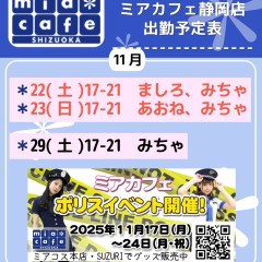 | 営業時間 | 静岡店は出勤スタッフがいれば営業です! 基本的に 12時~22時が営業時間です! ●静岡店のツイッター @shizuokamaidsan https://twitter.com/shizuokamaidsan ●ミア静岡店の営業曜日&営業時間● ☆月〜木 14:00〜22:00(最終受付20:00) ☆金曜日 12:00〜22:00(最終受付21:00) ☆土・日・祝 12:00〜22:00(最終受付21:00) 営業時間外はオンライン予約にてお願いいたします。 PC・携帯共通 → http://m-kanzume.moo.jp/yoyaku2/user.cgi ●ミアガイド出勤状況● スマホ・PC → 後日公開予定 ★静岡店スタッフによるミア甲府店でのメイドカフェリアル営業★ ☆不定期 サイトにてご確認ください。 http://market.chu.jp/schedule1/sche37.cgi | ||||||||||||||