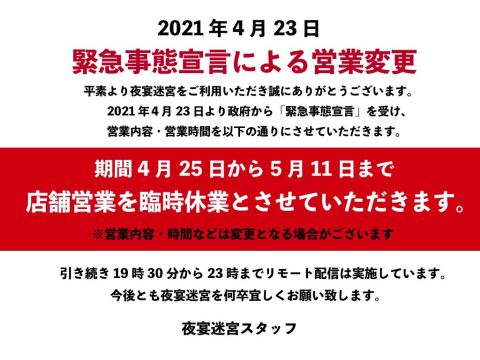 政府からの緊急事態宣言を受けて、店舗営業を臨時休業とします。